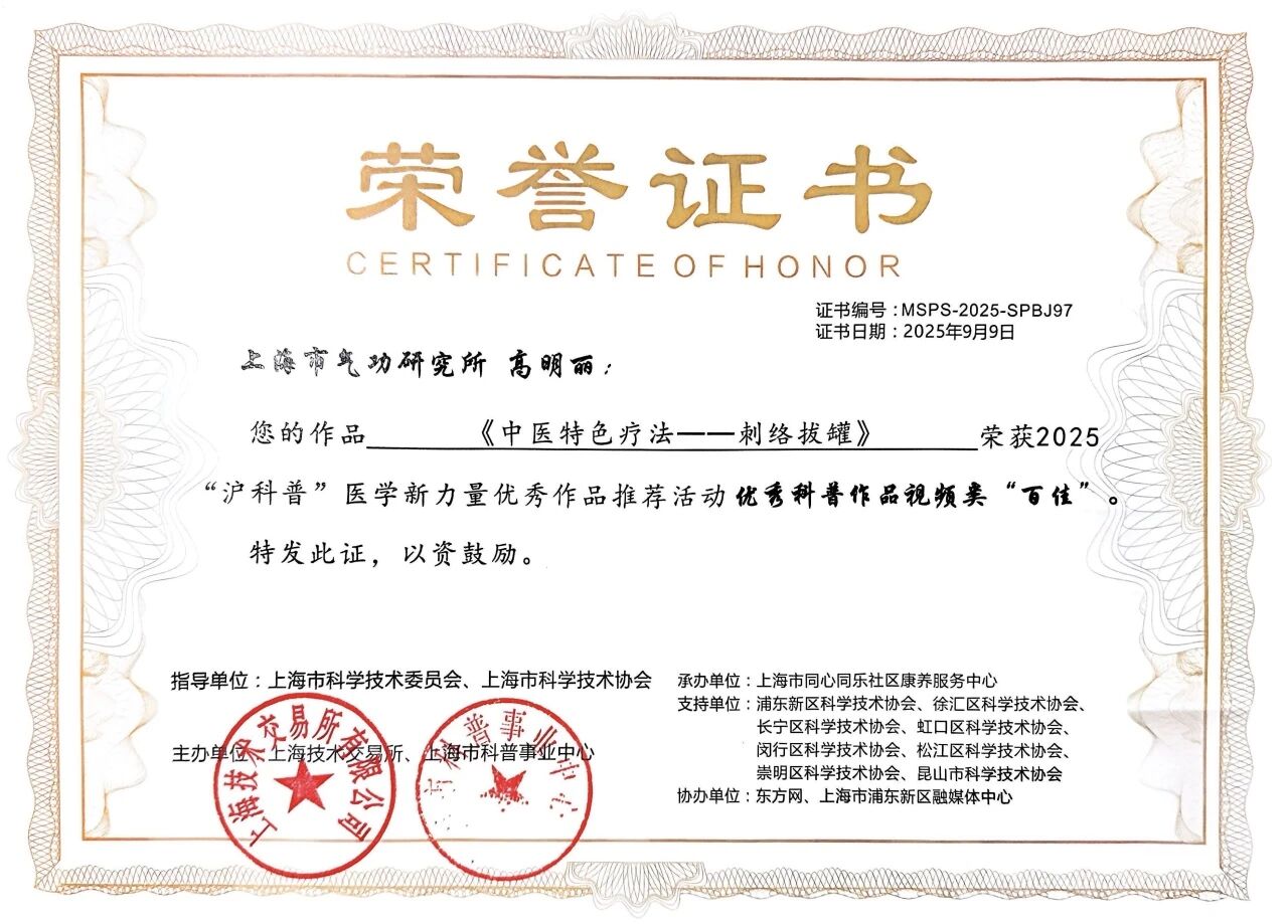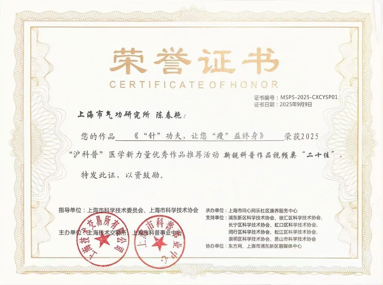 2025年9月9日,2025“沪科普”医学新力量优秀作品推荐活动发布仪式暨首届科普创制及传播峰会在沪隆重举行。本次峰会云集了上海市医疗卫生机构、科研院所、媒体平台等多领域的专家学者与科普创作者,共同探讨新时代背景下健康科普的创制规律与传播策略。本次活动旨在发掘和推广一批优质医学健康科普作品与人才,助力提升全民健康素养。活动现场揭晓了多项评选结果。 其中,上海市气功研究所副主任医师陈春艳主创的“针灸治疗肥胖症系列视频”之《“针”功夫,让您“瘦”益终身》凭借其科学性、创新性与通俗性,成功入选“新锐科普作品二十佳”,获得业界与公众的广泛认可。本视频聚焦于备受关注的肥胖健康问题,深入浅出地讲解了中医针灸在体重管理和促进健康生活方式方面的独特作用与原理。 主治医师高明丽创作的《中医特色疗法--刺络拔罐》获优秀科普作品视频类“百佳”,该视频以卡通人物与医生互动的形式,介绍了刺络拔罐疗法的治疗范围与操作方法,解答了大众对该疗法的顾虑与疑惑,有效助力中医特色适宜技术刺络拔罐疗法的推广与普及。 2025“沪科普”医学新力量优秀作品推荐活动在上海市科学技术委员会、上海市科学技术协会指导下,由上海技术交易所、上海市科普事业中心联合开展,该活动进一步动员和激励广大医务工作者投身科技志愿服务,为公众提供更优质丰富的健康科普内容。我所本次选送的科普视频,巧妙运用直观的动画演示、通俗的语言解读,将深奥的中医理论变得生动有趣,有效破除了公众对健康问题的常见误区,引导大众建立科学的健康观念,充分展现了传统中医在现代健康管理中的价值与魅力。 |